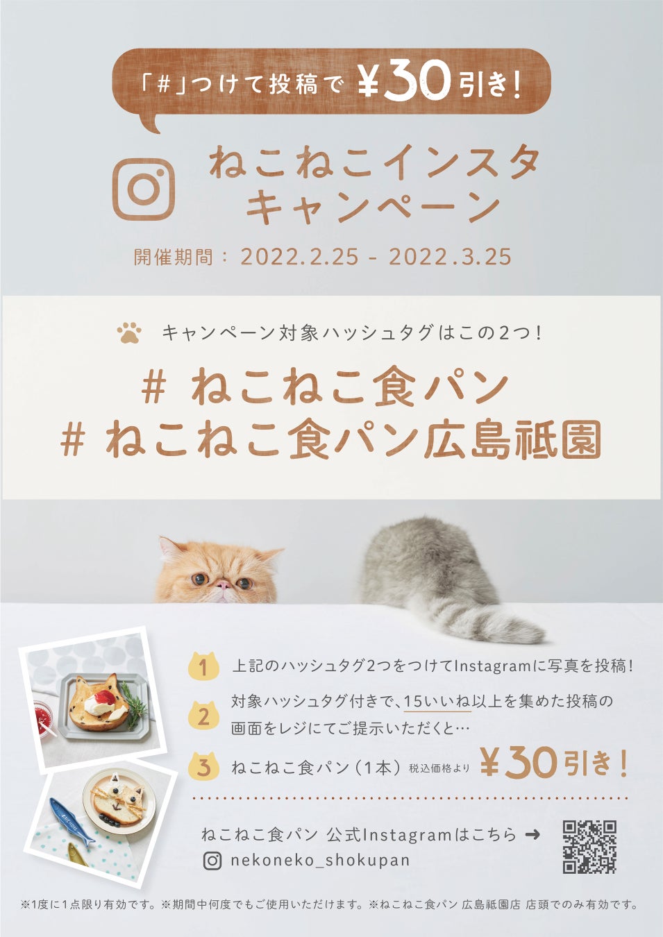 ・内容:ご自身のインスタグラムに下記の2つのハッシュタグを付けて「ねこねこ食パン」を投稿していただき、「♥15いいね」をゲットすると、ねこねこ食パン1本が30円引きになります。