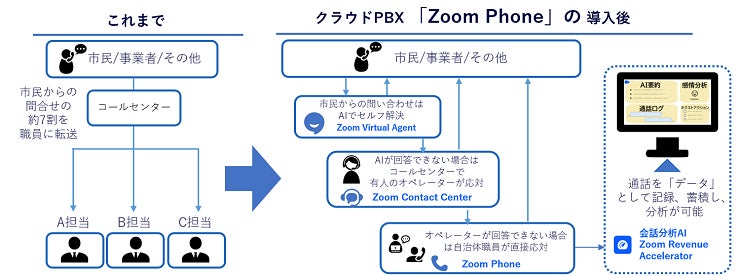 自治体において「Zoom Phone」「Zoom Contact Center」「Zoom Virtual Agent」を統合導入し、職員の負担軽減と市民サービスの向上を図る取り組みは日本初の事例。