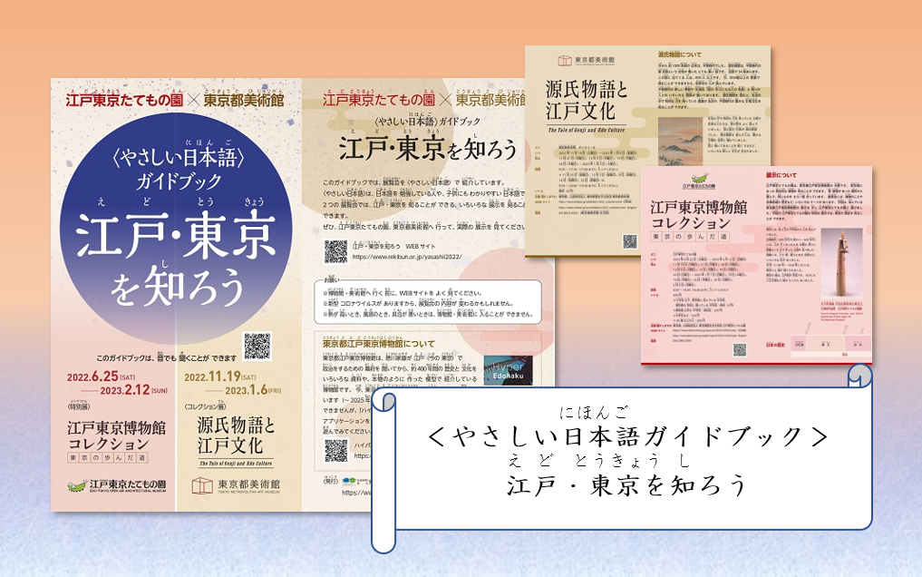 在日外国人の皆様をはじめ日本語を学習中の方が気軽に博物館・美術館を訪れ、江戸・東京のコレクションを楽しめるように、易しい・優しい日本語で表記しています。これまで博物館や美術館に足を運んだ経験が少ない方も、是非このガイドブックをご利用ください。