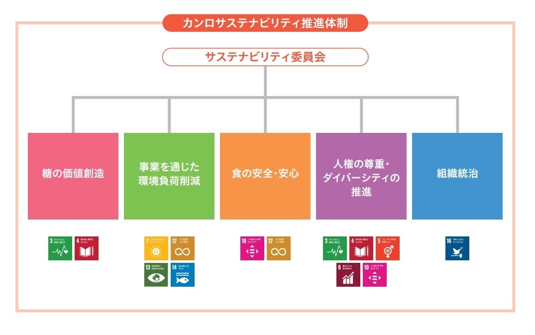 カンロは、企業パーパス「"Sweeten the Future"心がひとつぶ、大きくなる。」の下、事業を通じて社会課題の解決に寄与しながら、企業価値を向上させることで、人と社会の持続的な未来に貢献することを目的に、カンロサステナビリティ推進体制を構築。サステナビリティ委員会のもと5つの活動領域を定めています。