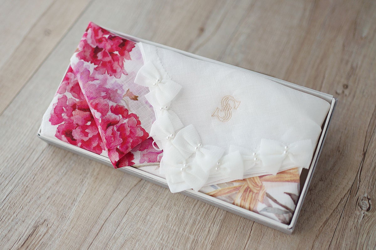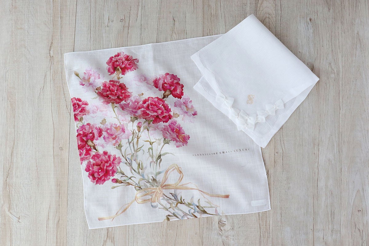 両手からあふれるようなカーネーションを優しいタッチで描いた一枚と、チュール生地の立体的なリボンをあしらったハンカチにイニシャル刺繍をお入れした特別なハンカチをセットに。花束を贈るように、ハンカチーフを贈ってみませんか。