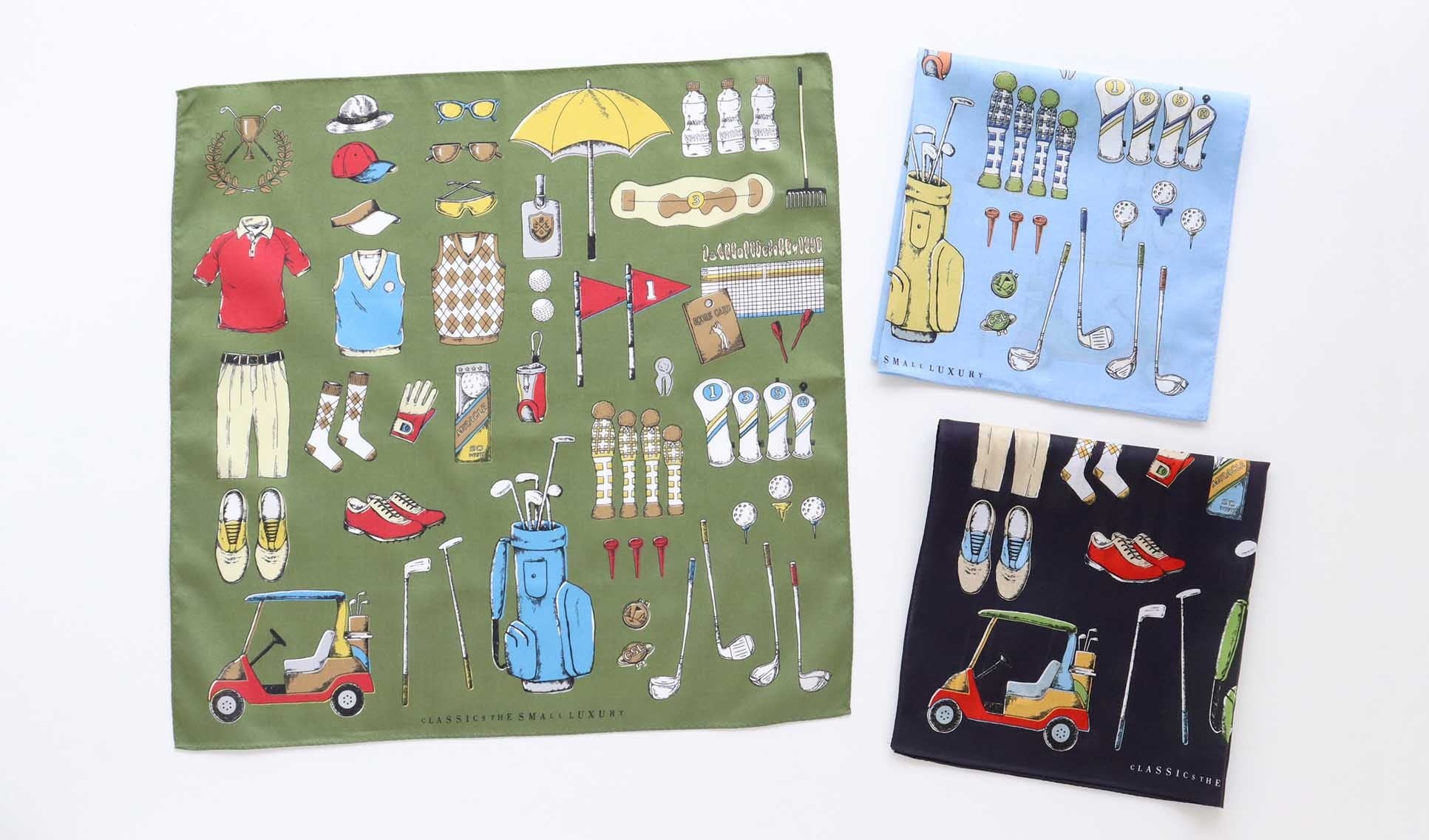 メンズはロングセラー商品のネイビーに加えて、カーキとブルーが新色として登場。ゴルフクラブやゴルフボール、ゴルフカートにキャディバッグ、スコアカードなど、ゴルフに関する様々なアイテムを丁寧に表現したハンカチーフ。