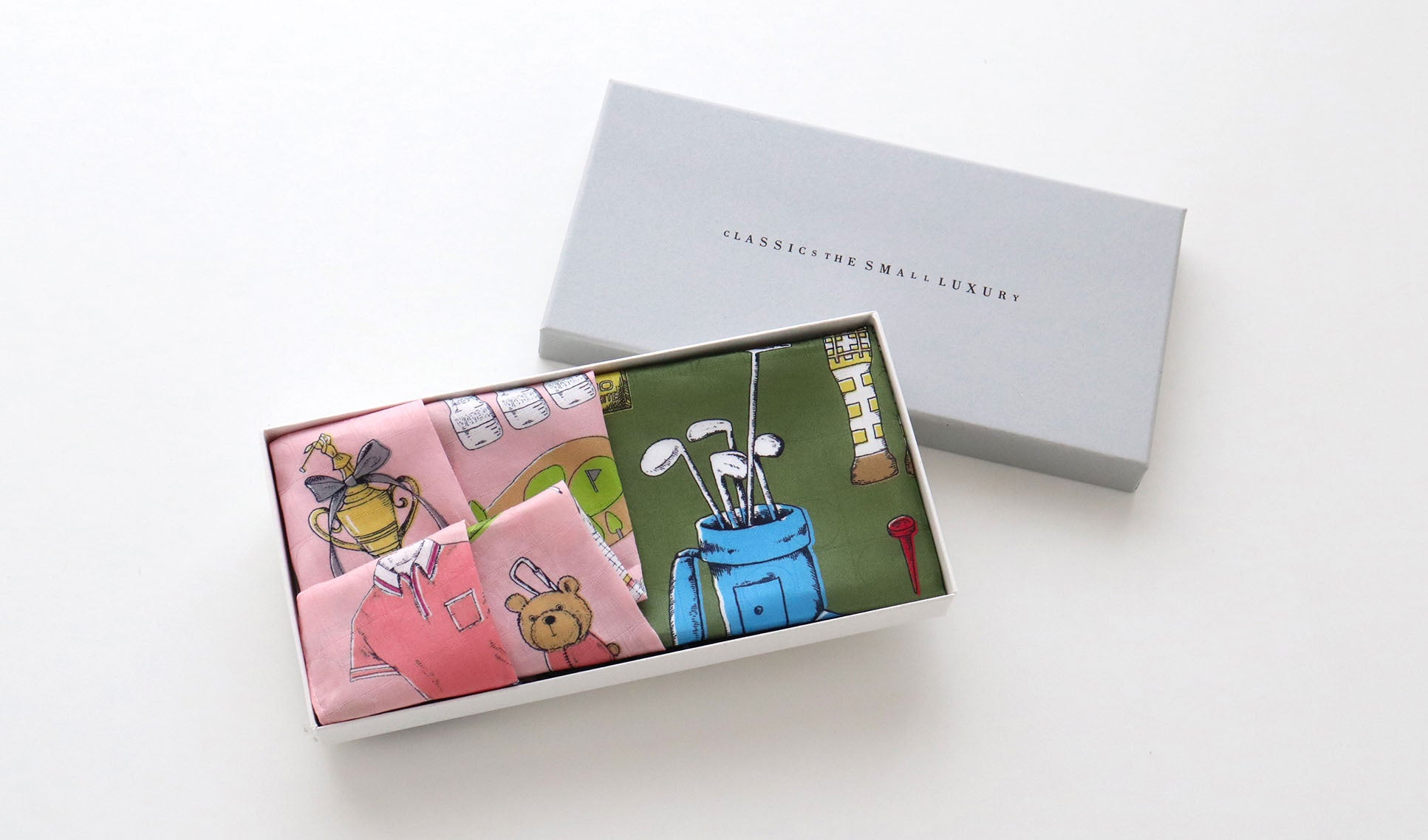 CLASSICS the Small Luxury (クラシクス・ザ・スモールラグジュアリ)は、東京、日本橋人形町を拠点に日本のハンカチーフ業界のパイオニアである、繊維製品企画販売のブルーミング中西株式会社(本社 東京都 中央区 取締役社長 中西一) が運営するハンカチーフ専門店です。2025年4月15日(火)より、新作「ゴルフ柄ハンカチーフ」の販売を開始しました。