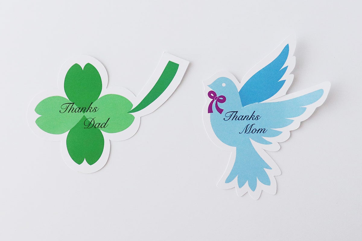 特別な一枚をより素敵な贈り物に。2025年4月15日(火)より、期間限定サンキューチャームをご用意しております。四葉のクローバーには「Thanks Dad」、青い鳥には「Thanks Mom」のメッセージ入りです。※無くなり次第、終了となります。