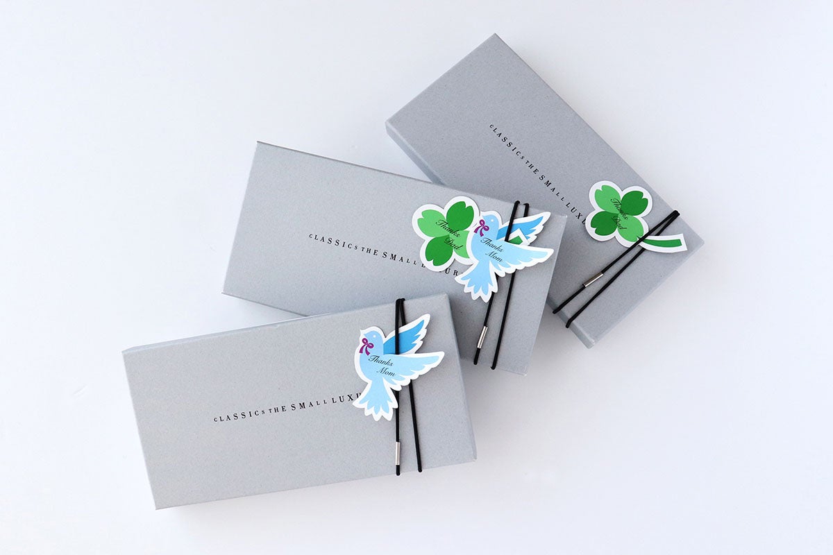 また、2025年4月15日(火)より、幸福の象徴「四葉のクローバー」と「青い鳥」をモチーフにした期間限定オリジナルサンキューチャームをご用意しております。母の日や父の日の贈り物にぴったりな仕様となっております。