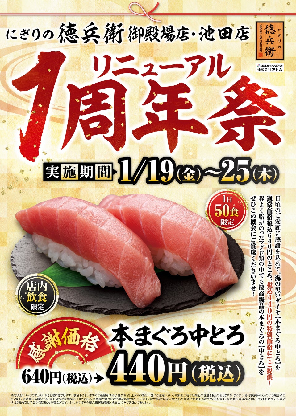 グルメ廻転寿司 にぎりの徳兵衛 御殿場店・池田店日頃のご愛顧に感謝して!本まぐろ中とろを感謝価格でご提供!リニューアル1周年祭 2店舗同時開催!