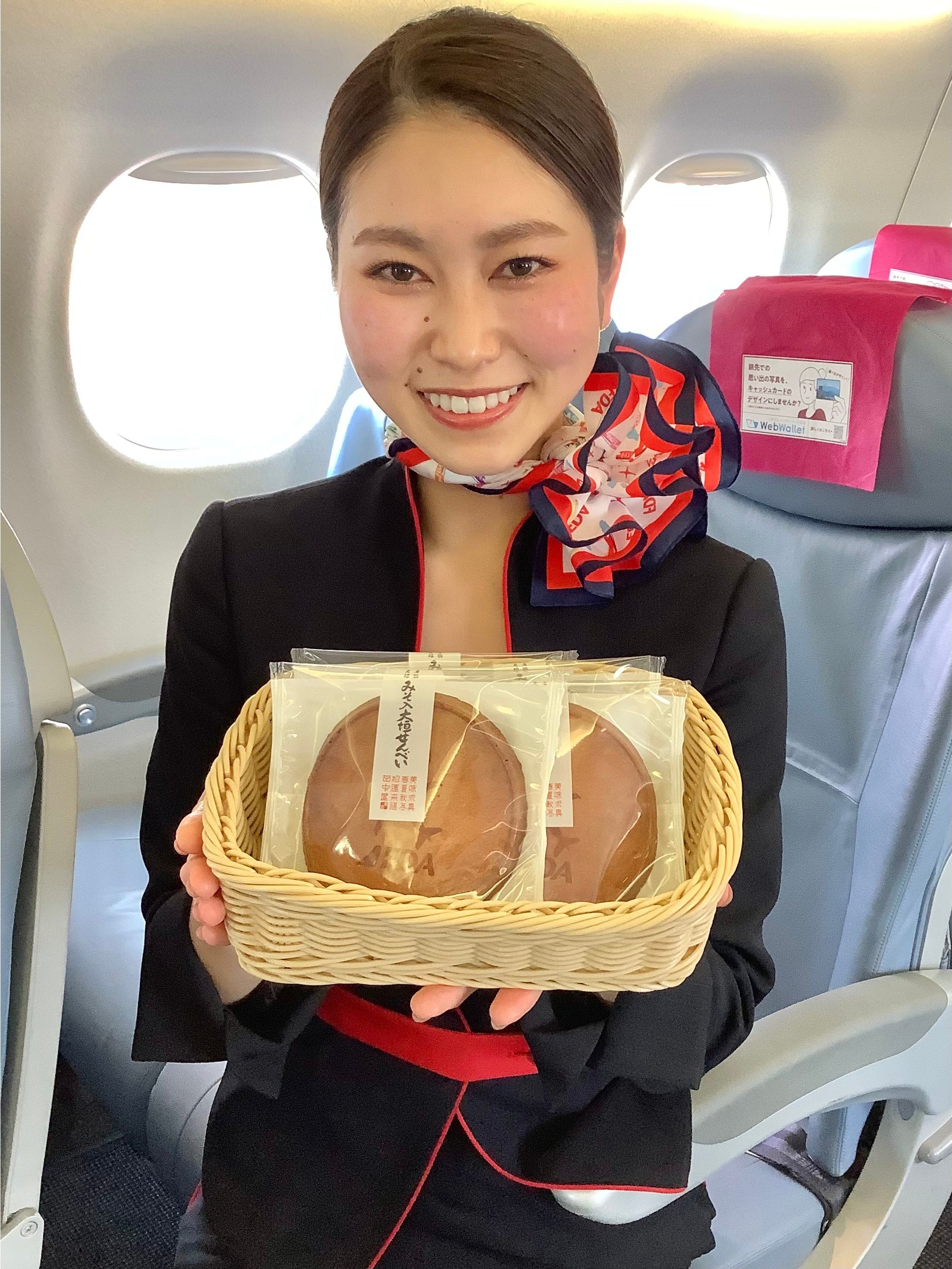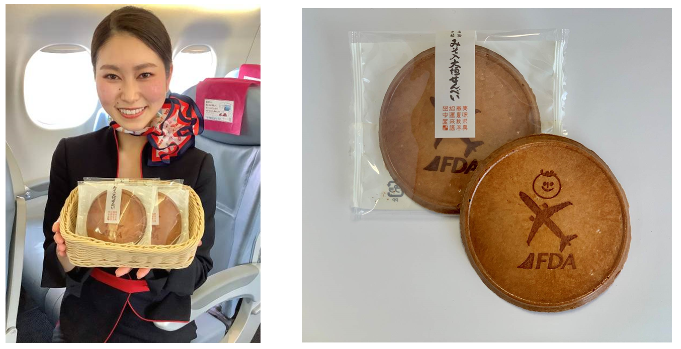 また、今回は『田中屋せんべい総本家』さまのご協力により、『田中屋せんべい総本家×FDAオリジナルデザイン』となります。是非機内にて、お楽しみください。