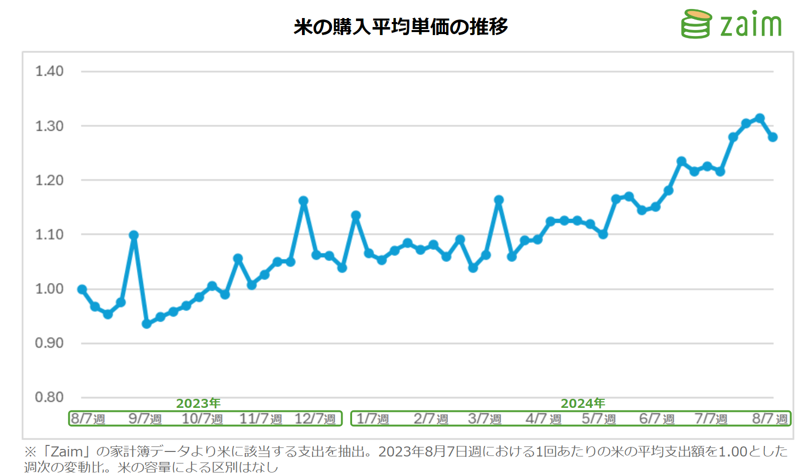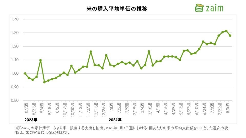 くふうカンパニーグループが運営する家計簿サービス「Zaim」のデータによると、ユーザーの1回あたりの米の支出額はじわじわと上昇し続けており、2024年8月の米の購入平均単価は1年前と比較して約1.3倍になっていることがわかります。