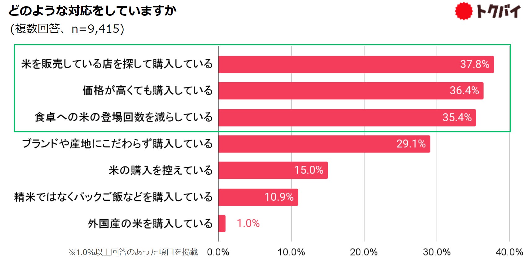 その困った状況にどう対応しているかを聞いたところ、「米を販売している店を探して購入している」37.8%、「価格が高くても購入している」36.4%、「食卓への米の登場回数を減らしている」35.4%が僅差で並びました。