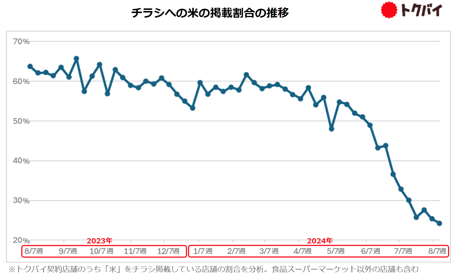 また、画像解析AI技術を活用して「トクバイ」に掲載されたデータを分析する「チラシアナライザー」を用いてチラシにおける米の掲載割合を見たところ、2024年6月よりその割合が急落しており、8月の時点で1年前と比較して約6割減少しています。品薄によりチラシへの米の特売情報が掲載されることが少なくなった状況がわかります。