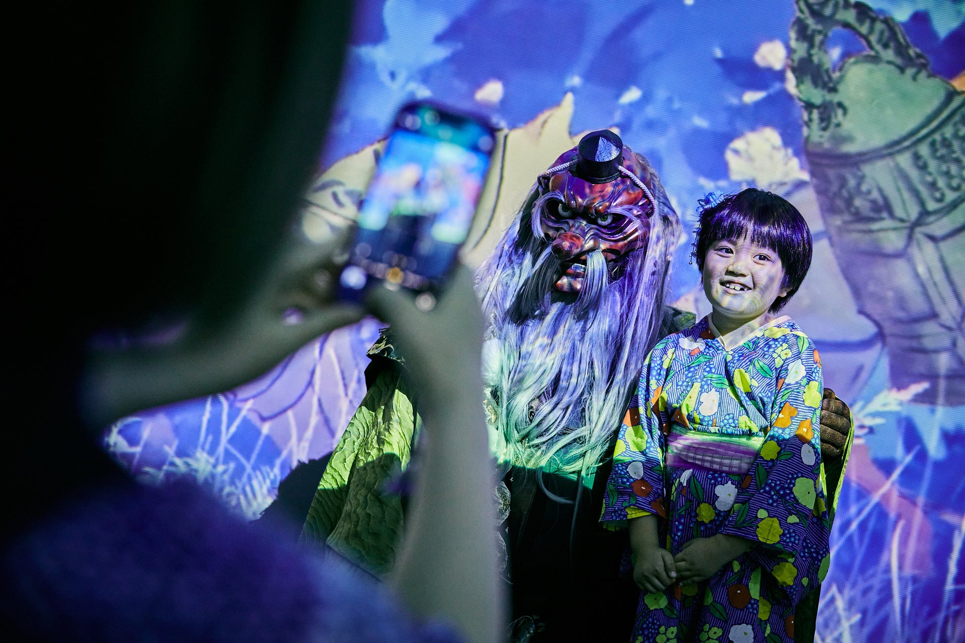 会期中の土・日とお盆期間は、「天狗」「鬼」「河童」「栄螺鬼(さざえ鬼)」「座敷わらし」など、ポップでユーモラスな日本古来の妖怪たちが会場を巡回します。最先端の映像技術を駆使したイマーシブ空間を等身大の妖怪が彩ることで、まるで妖怪の世界に迷いこんだかのような体験をお楽しみいただけます。妖怪たちと一緒に写真撮影もいただけます。