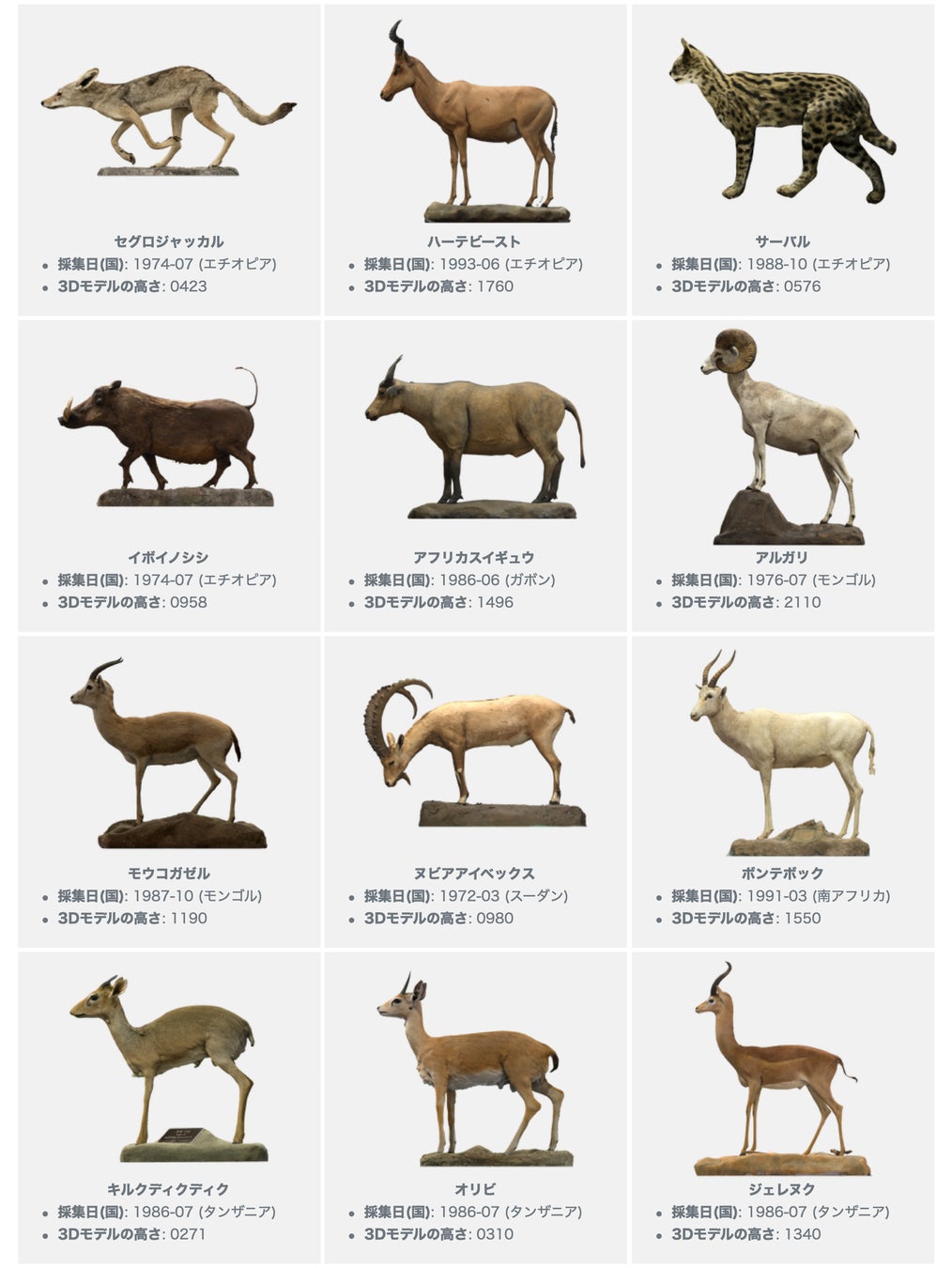 そこで、ヨシモトコレクションの中から、これまでに作成してきた23点の哺乳類剥製3Dモデルについて、その剝製標本としての情報と生物種としての情報を集約し、Web上で閲覧可能な「剥製3Dデジタル図鑑 “Yoshimoto 3D”」を開発し正式公開しました。剥製3Dモデルそのものだけでなく、図鑑のように閲覧できる多数の情報と、各動物種を比較や検索可能なインターフェイスを備えています。世界的な生物データベース群※1から情報を取得しており、最新の動物の状況も確認できます。