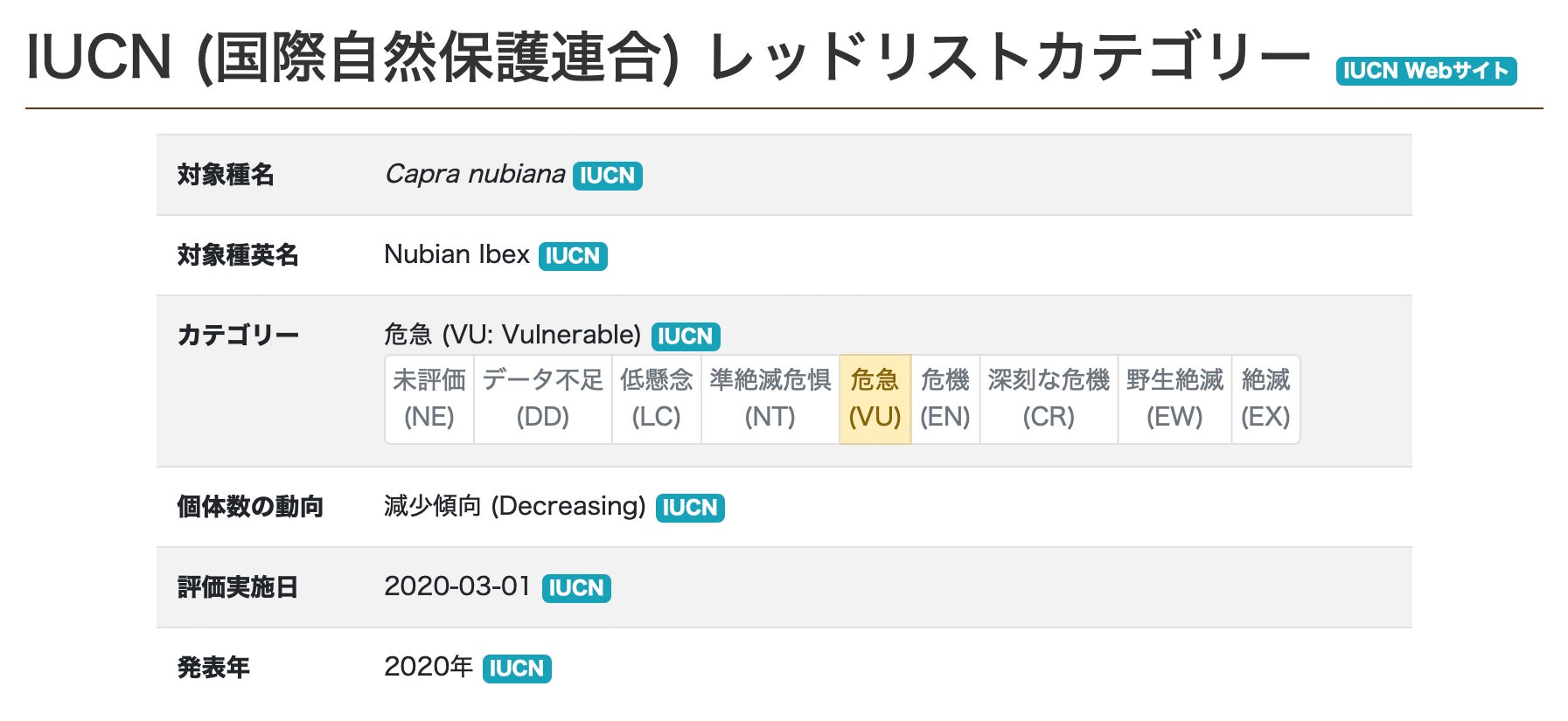 外部データベースである国際自然保護連合(International Union for Conservation of Nature)のレッドリスト(絶滅の恐れのある生物種リスト)に記載されている種では、レッドリストカテゴリー(どの程度絶滅のおそれがあると評価されているかのカテゴリー)やそのカテゴリーがいつの評価にもとづくものか、個体数の増減傾向などを確認できます。