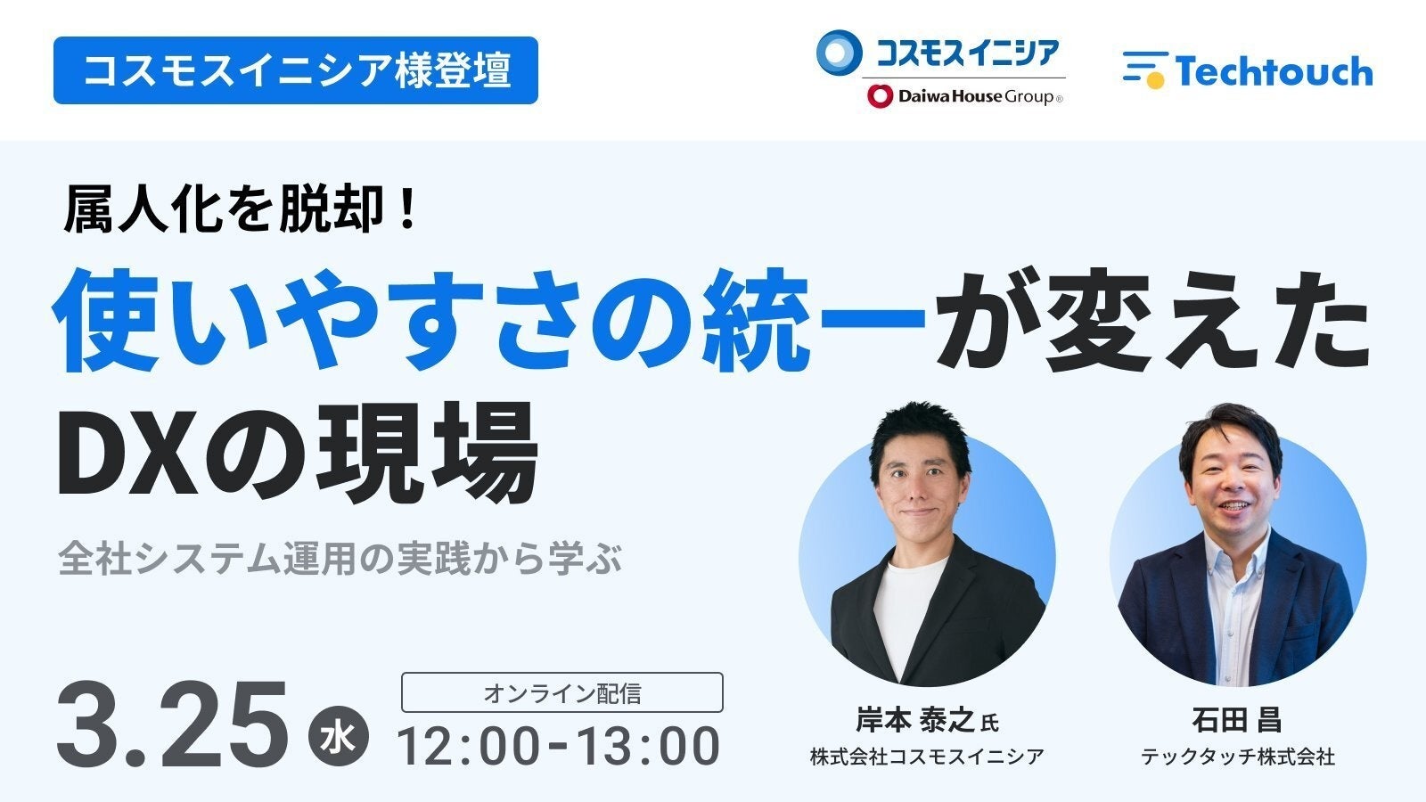 テックタッチ株式会社は、株式会社コスモスイニシアをゲストに招き、2026年3月25日(水)12時から無料オンラインセミナーを開催します。