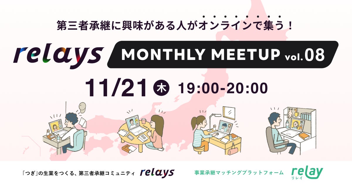 【オンライン交流会】第三者承継コミュニティ「relays(リレイズ)」、事業承継について気軽に話せるイベント「relays MONTHLY MEETUP vol.8」開催決定!11月21日(木)開催。