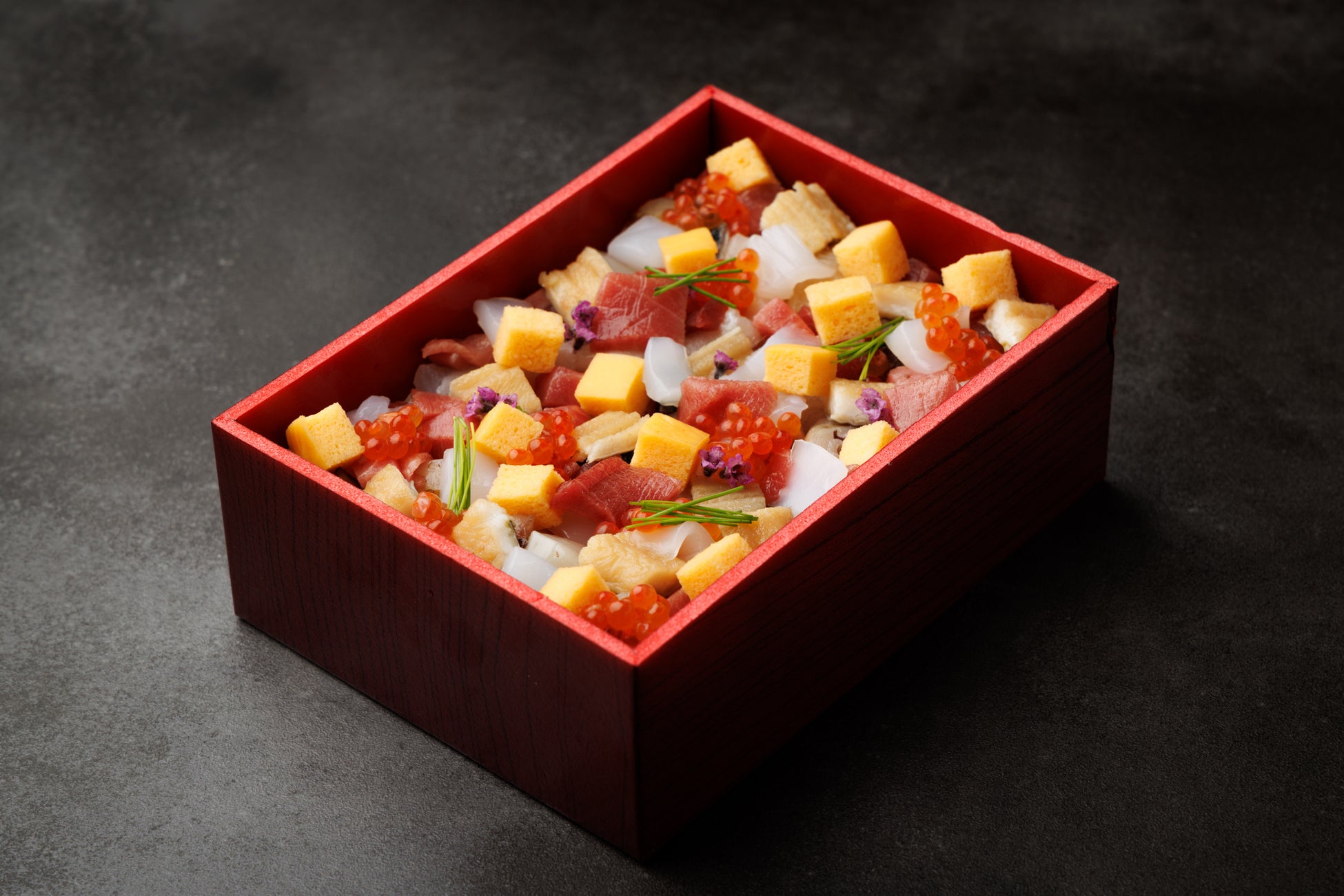 握りと同じ鮨ネタを贅沢に盛り込んだ、華やかな一折。