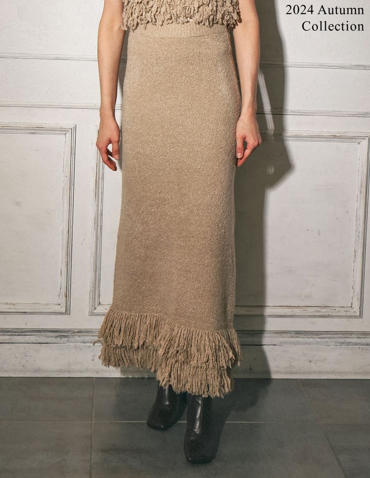裾のフリンジデザインがアクセントになり、秋冬のスタイリングを華やかにしてくれるニットスカートです。