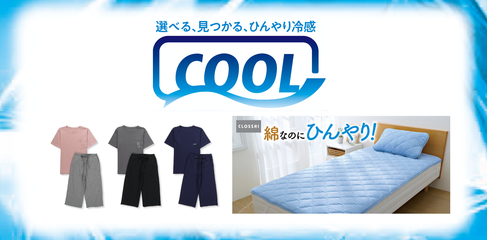 「COOL」は、「選べる、見つかる、ひんやり冷感」をコンセプトとした、接触冷感、吸水速乾、抗菌防臭に優れた商品です。PB「CLOSSHI」から展開しています。