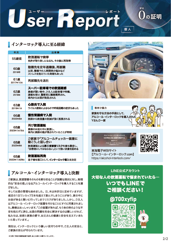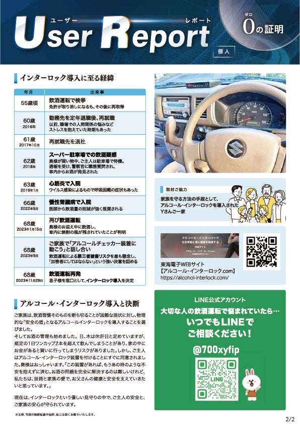 自動点呼システム、運行管理システム、安全運転管理システム、労働安全衛生システムを開発・販売する東海電子株式会社(本社:静岡県富士市、代表取締役:杉本哲也)は、アルコール・インターロック装置「ALC-ZEROⅡ」を個人のクルマに導入いただいたお客様へのインタビューをもとにした導入事例を公開しました。