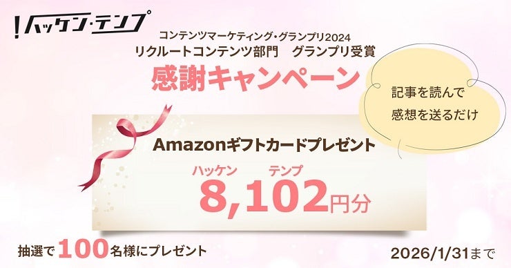 本キャンペーンでは、『ハッケン・テンプ』の記事を読んで感想を送っていただいた方の中から抽選で100名様に、“8,102(ハッケン・テンプ)円”のAmazonギフトカードをプレゼントします。どなたでもご応募いただけますので、ぜひご応募ください。