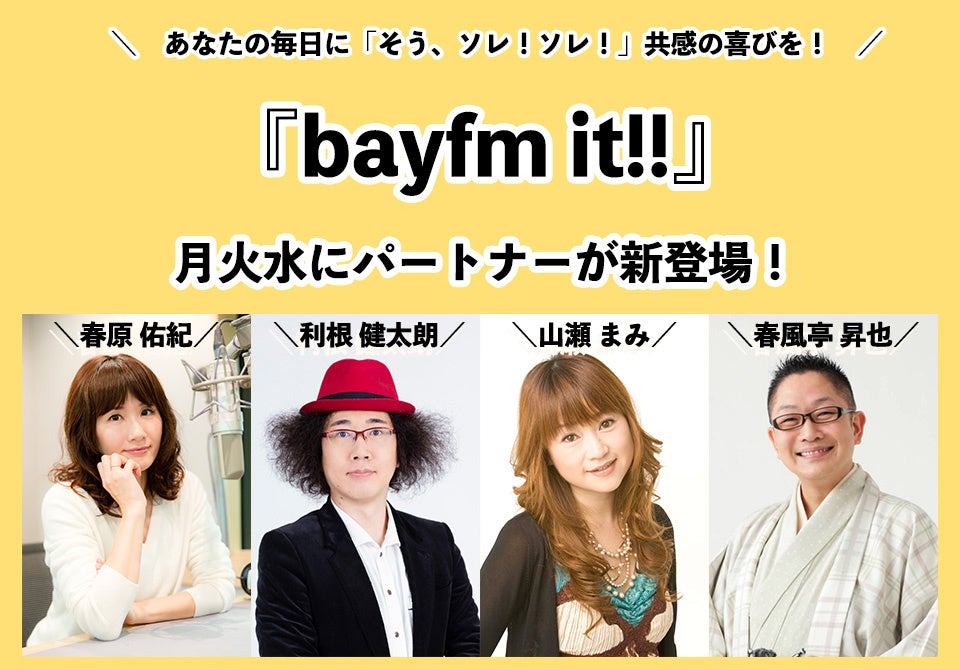 フリースタイル型本音共感ラジオ『bayfm it!!』は番組放送時間を毎週月〜木12:51に繰り上げ。更に、月〜水(DJ:春原佑紀)に新たにパートナーが登場。声優・利根健太朗 (月)、山瀬まみ(火)、千葉県野田市出身の落語家・春風亭昇也 (水)がベイエリアの午後を盛り上げます。