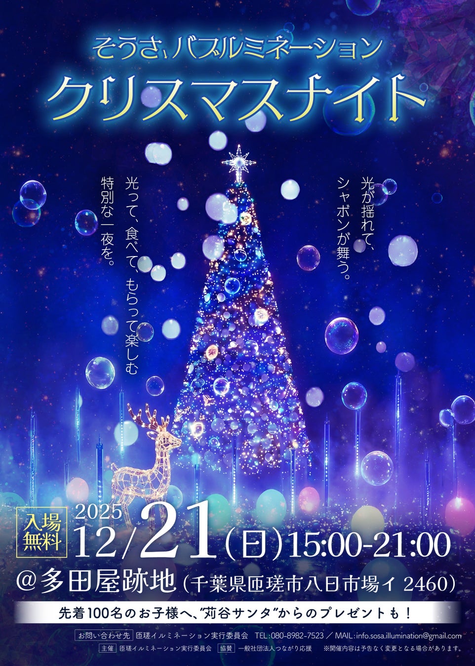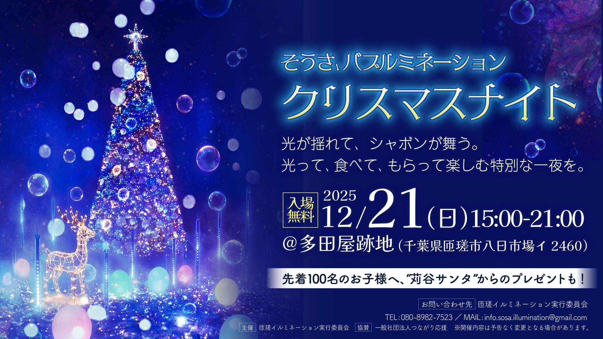 ファーストイノベーション(本社:東京都中央区晴海3-13-1 52F、代表取締役社長:木ノ根雄志)は、官民連携の地方創生団体『一般社団法人つながり応援』(理事長:清水国明、副理事長:木ノ根雄志・梶川隆史)が展開する『つながり応援プロジェクト』の一環として、千葉県匝瑳市で12月21日に開催される地域イルミネーションイベント「そうさ イルミネーション クリスマスナイト」への協賛を決定しました。