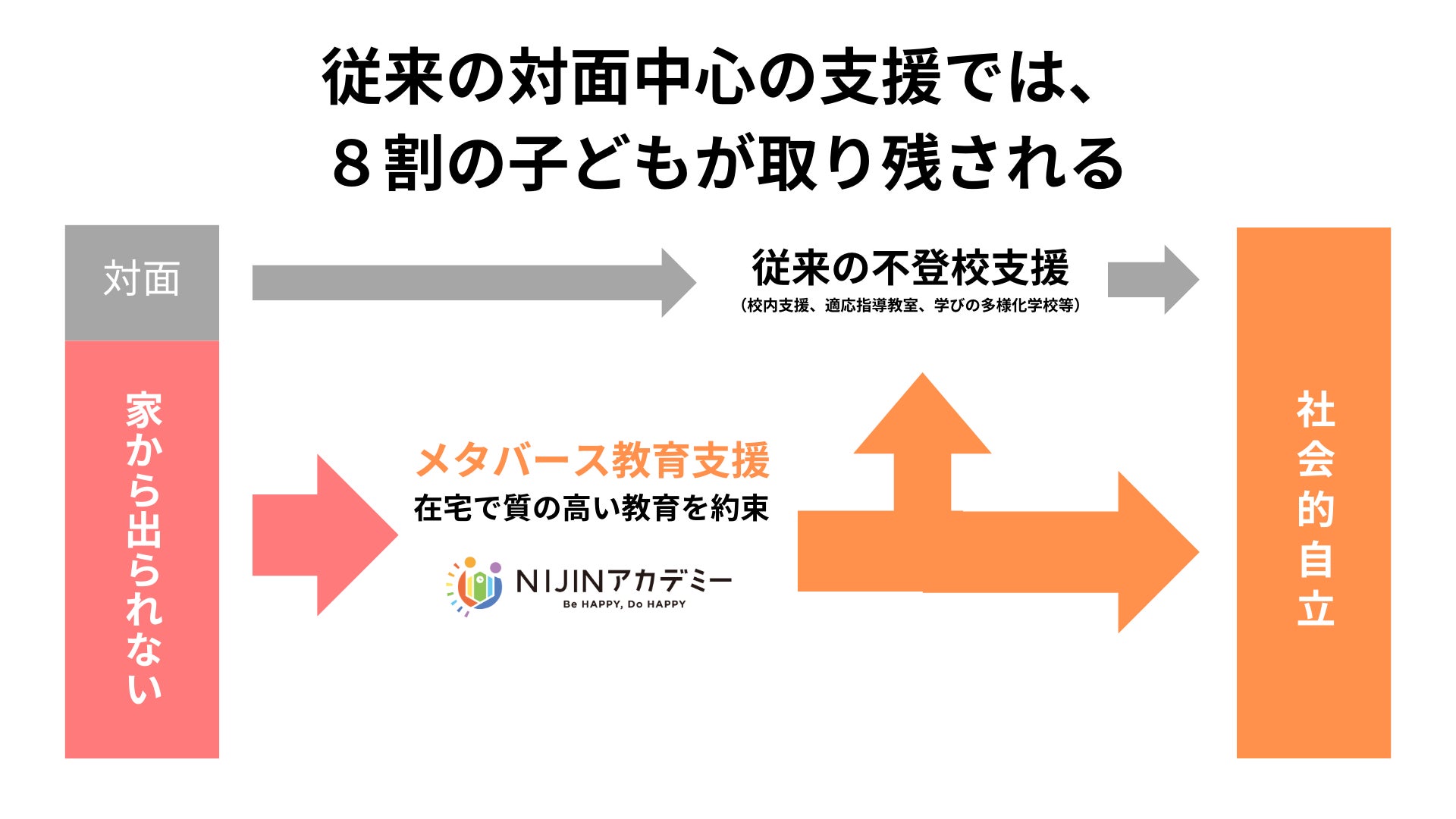 現状、従来の対面中心の支援では、「家から出られない」等の理由から約8割の子どもが取り残されている事実があります。その中で、在宅でも質の高い教育を約束すべく、メタバース教育支援を行っているのがNIJINアカデミーです。