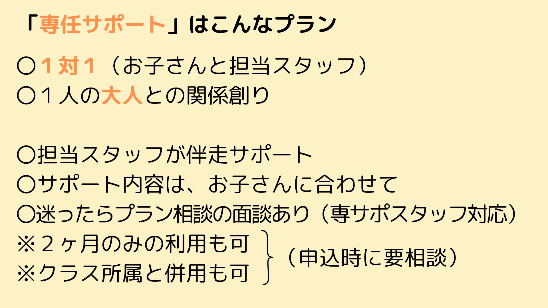 専任サポートプランの利用には、子どもの現在の状況や親子の要望に応じて柔軟な対応が可能です。例えば、入学当初のみなどの「期間限定の利用」や「スタンダードプランとの併用(少人数学級に所属)」ができます。専任サポートプランからスタンダードプランへの移行もいつでも可能です。(事前申請が必要)