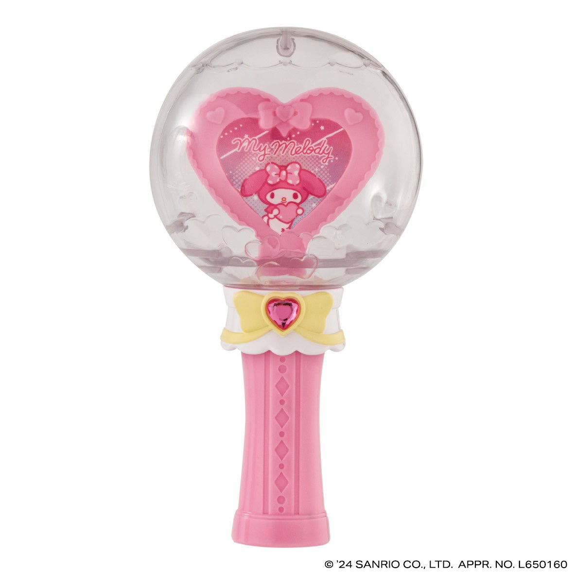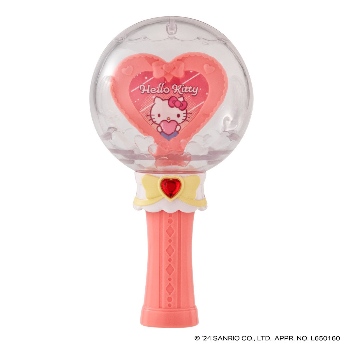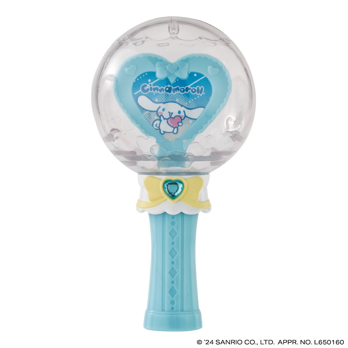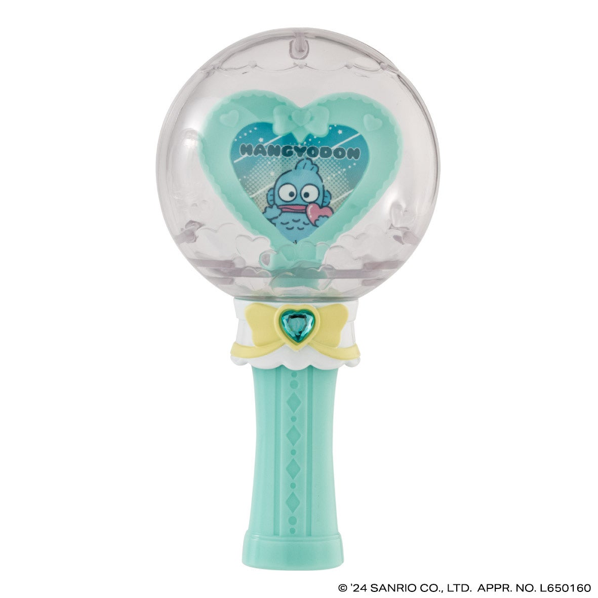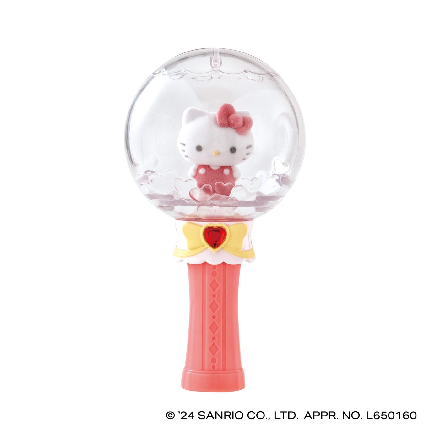 本商品は、ペンライト風デザインの全高約130mmのステッキです。カプセルレスになっており、パーツを組み立てるとステッキ型になります。本体とハート形のラインストーンの色はそれぞれのキャラクターをイメージしたカラーのデザインです。手持ち部分を取り外して飾ることもできます。別売り商品の「サンリオキャラクターズ ふわふわフロッキードール」や、好きなフィギュアを中に入れて飾ってもかわいい仕様です。