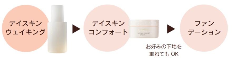 今回の「デイスキンウェイキング」は、「デイスキンコンフォート」と合わせてお使いいただくことで、メイク前の肌コンディションを整えられるような設計となっています。メイクに適したお肌の水分と油分のバランスに着目し、みずみずしく浸透 ※1 し、水分を与える「デイスキンウェイキング」と、うるおいで蓋をする「デイスキンコンフォート」の2 品を合わせてお使いいただくことで、日中もうるおいは保ちながらもメイクに響くべたつきは感じない相性となっています。