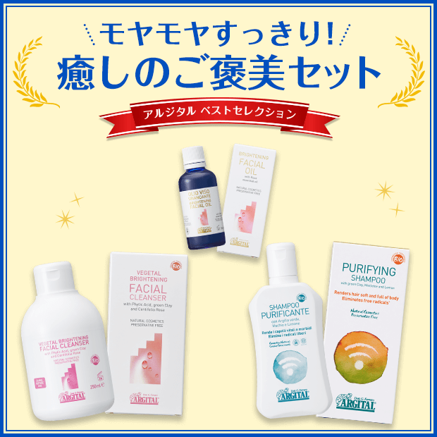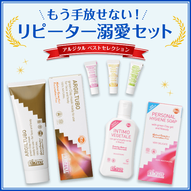 イタリア・シチリア島⽣まれのオーガニックコスメブランド『アルジタル』の人気No.1「グリーンクレイペースト」とNo.2「デリケートハイジーンソープ」に、保湿クリームの人気TOP3のミニサイズをセットにしました。