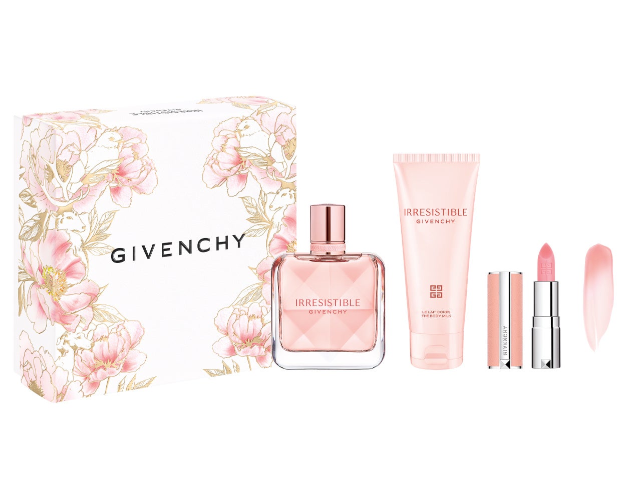 セット内容: イレジスティブル オーデパルファム 50mL(現品)、イレジスティブル ボディミルク 75mL(トラベルサイズ)、ローズ・パーフェクト No.001(ミニチュアサイズ)