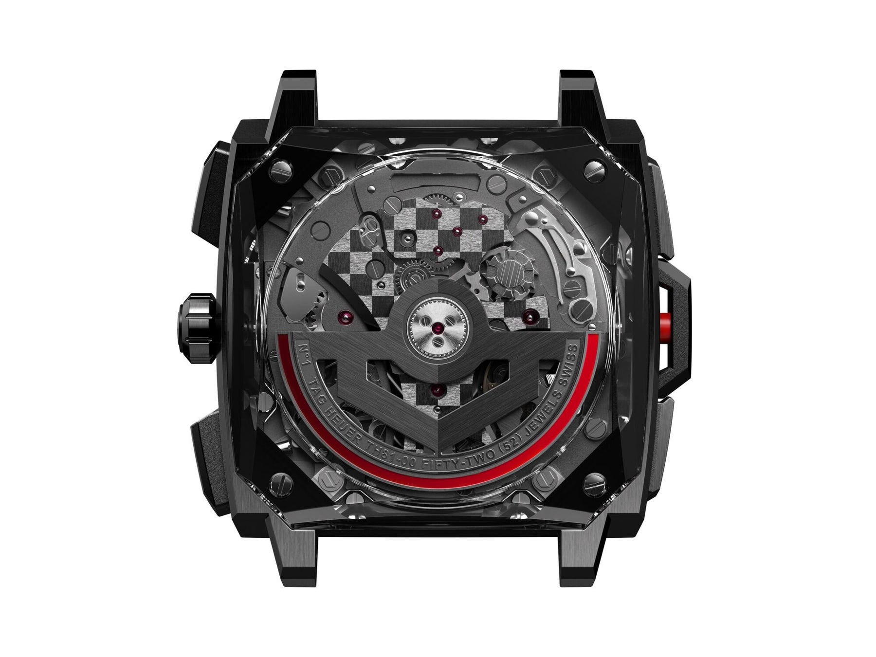 タグ・ホイヤー モナコ スプリットセコンド クロノグラフの中核を成すのは、新たに発表されたTH81-00機械式スプリットセコンドクロノグラフキャリバーです。ムーブメントは100%チタン製で、タグ・ホイヤーとムーブメント製造において世界的に名高いヴォーシェ・マニュファクチュール・フルリエのコラボレーションによって生まれた自動巻クロノグラフムーブメントのなかでも最軽量です。