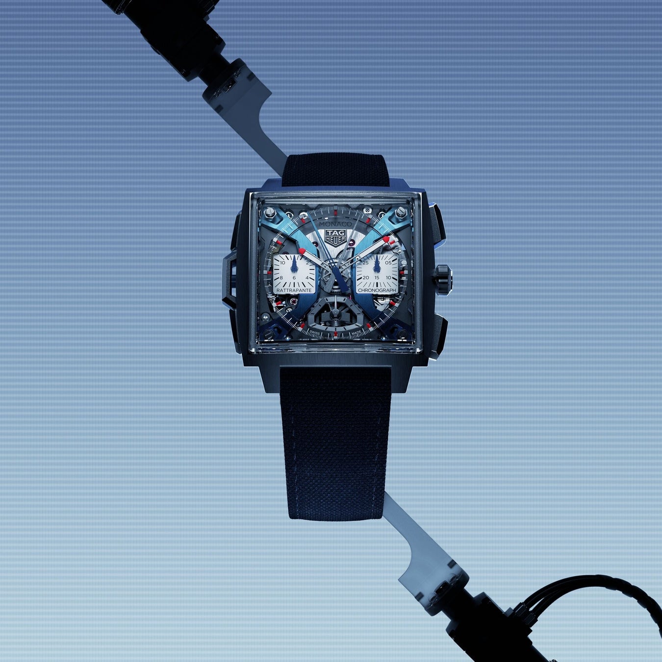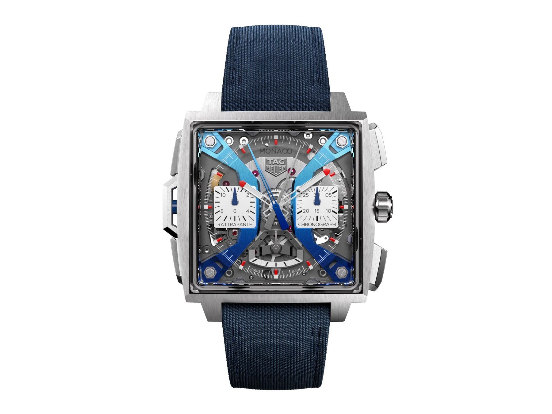 レッド、ブルーのいずれのモナコも9時位置にラトラパンテ針と同色のプッシュボタンを配し、スプリットセコンド機能を際立たせるとともに、全体の色彩を調和させています。6時位置のスモールセコンドダイヤルはアーチの形状を再現しており、3時位置の「ラトラパンテ」と9時位置の「クロノグラフ」の文字は、時計造りに注いだ偉大な技術をさりげなく連想させます。