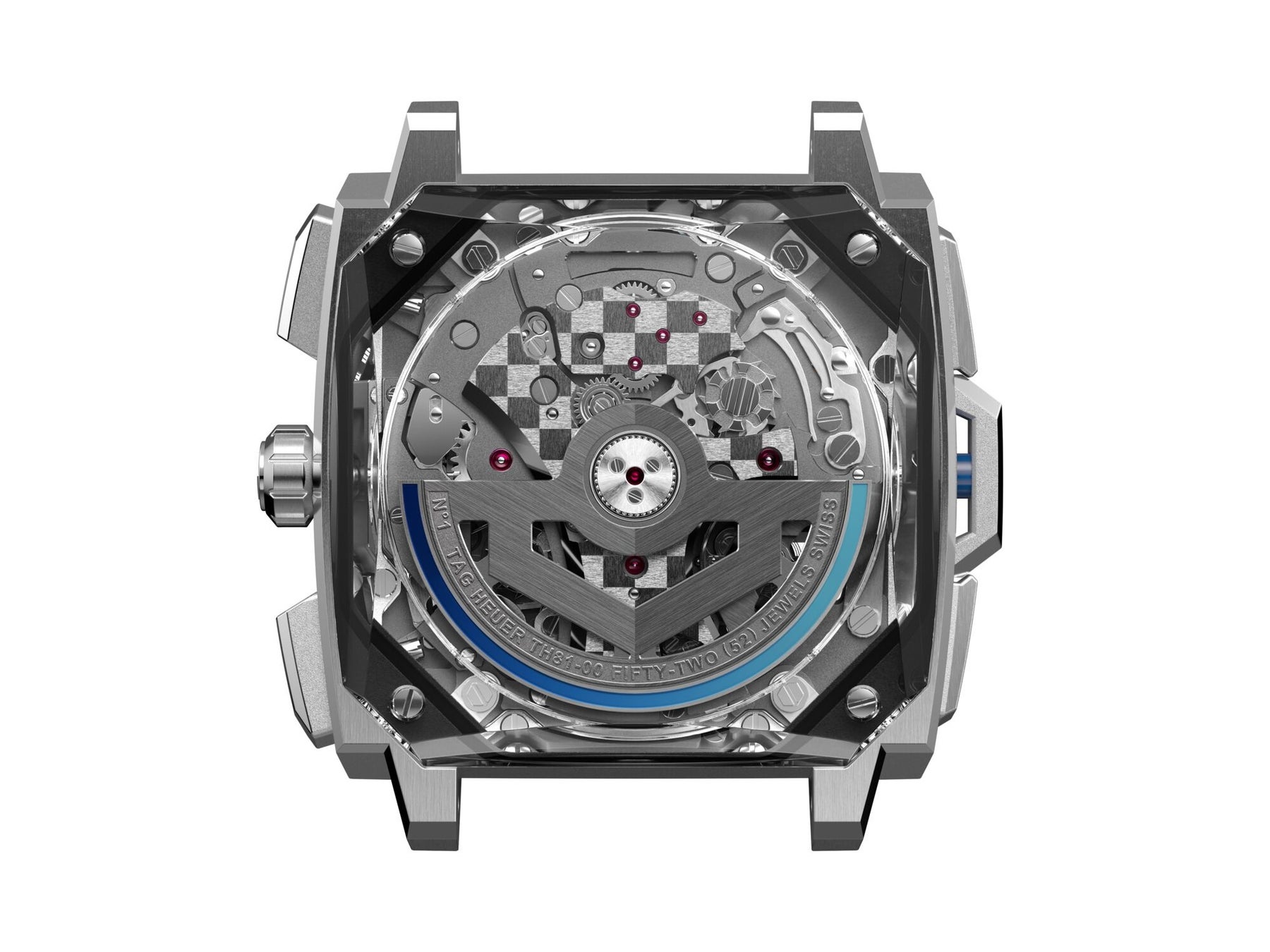 センターブリッジにはタグ・ホイヤーのシンボルであるチェッカーボード模様を施し、サテン仕上げのテンワブリッジの面取り部分はポリッシュ仕上げです。これらすべてが手作業で造られており、最高レベルの仕上げにかけるメゾンの情熱が表れています。サンドブラスト加工の表面とポリッシュ仕上げのスクリューがさらに、ムーブメントの仕上げに注がれた熟練のクラフツマンシップを際立たせています。