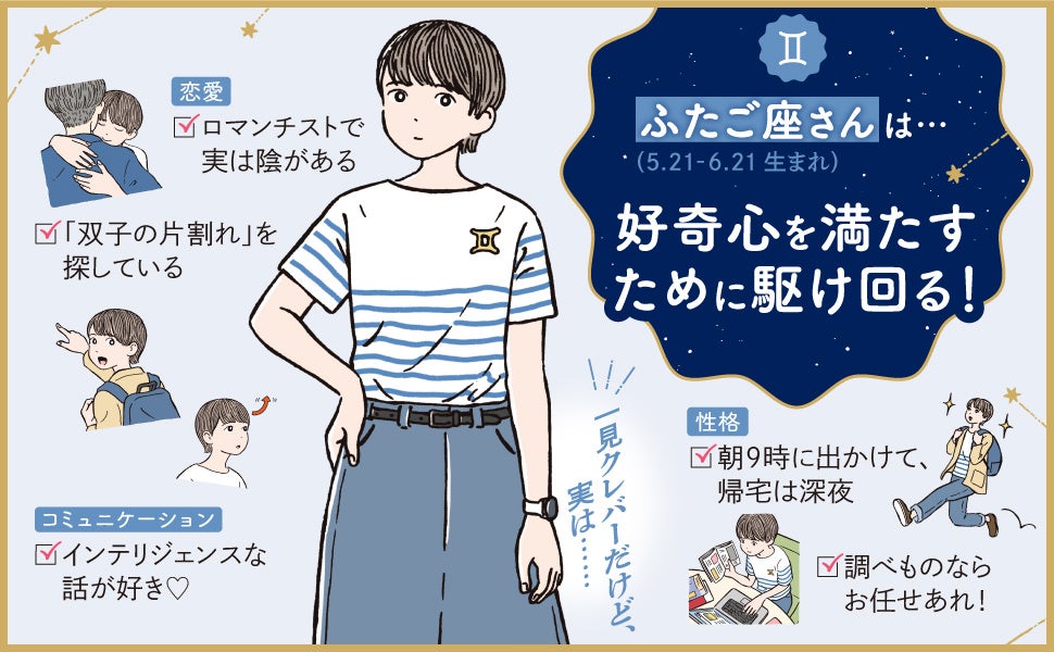 12星座別の「リアルで笑える星座あるある」を通じて、長所や短所、意外な一面、独自の価値観など、各星座が持つ個性と、その取り扱い方を約800個の「あるある」で紐解きます。