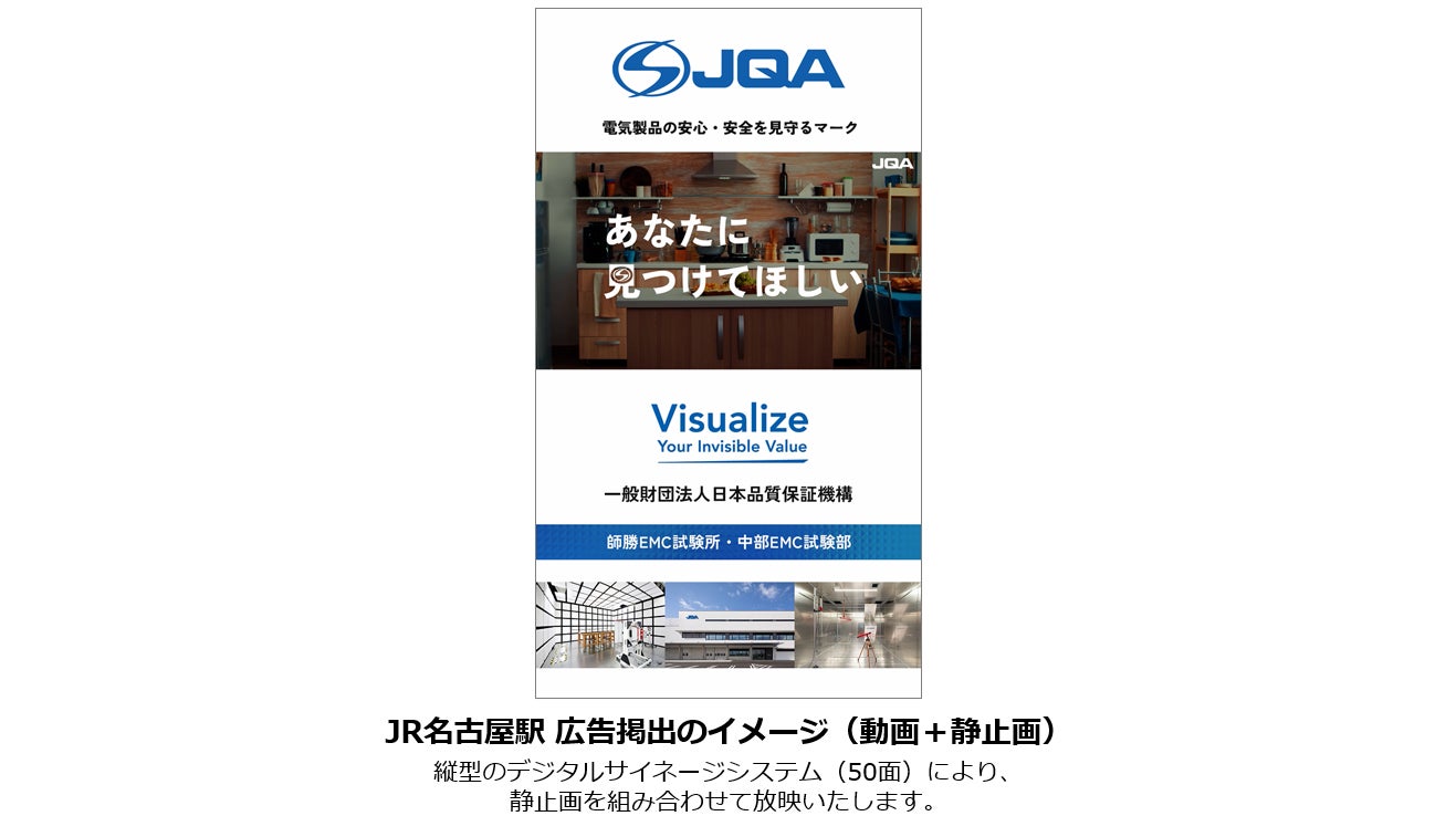 一般財団法人日本品質保証機構(本部:東京都千代田区、理事長:石井 裕晶)は、S-JQAマーク認証(※)30周年を記念し、東京地区(京王電鉄 京王線車両内ほか)、大阪地区(Osaka Metro 御堂筋線車両内ほか)および名古屋地区(JR東海 名古屋駅コンコース内)の計3地区において、鉄道広告を掲出いたします。