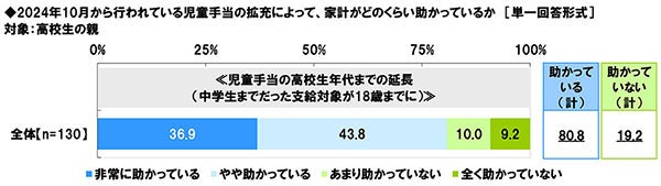 ◆高校生の親の8割が「児童手当の高校生年代までの延長で家計が助かっている」と実感
