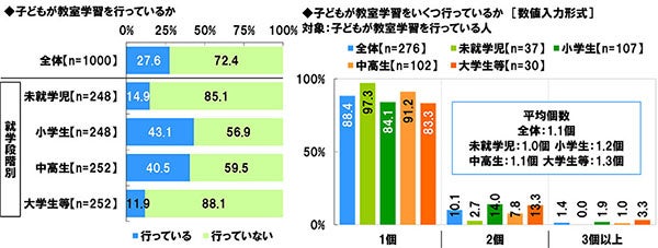 全回答者に、子どもが教室学習(学習塾、英会話、そろばん教室、プログラミング教室など)を行っているか聞いたところ、「行っている」は27.6%、「行っていない」は72.4%でした。
