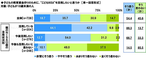 子どもが18歳未満の人(728名)に、子どもの教育資金作りのために、“こどもNISA”を活用したいと思うか聞いたところ、「非常にそう思う」が18.7%、「ややそう思う」が35.7%で、合計した「そう思う(計)」が54.4%、「全くそう思わない」が14.7%、「あまりそう思わない」が30.9%で、合計した「そう思わない(計)」が45.6%と、活用したいと考えている人が多数派となりました。