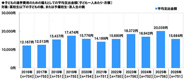 平均支出金額を過去の調査結果と比較すると、2025年20,039円→2026年15,684円と、4,355円減少しました。学校外教育費だけでなく、進学費用の準備としての月々の支出金額も減少しており、物価上昇に伴う生活費の増加などにより、子どもの教育に関する出費にまわす余裕がないケースがあるのではないでしょうか。 (図18)