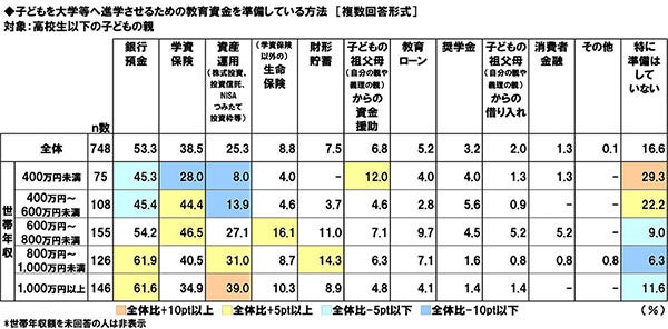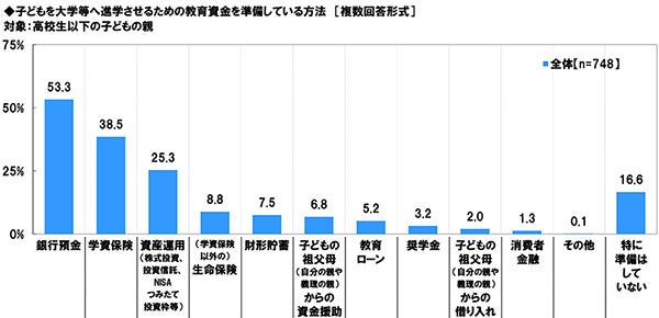 高校生以下の子どもの親(748名)に、大学等への進学のための教育資金を、どのような方法で準備しているか聞いたところ、「銀行預金」(53.3%)が最も高くなり、「学資保険」(38.5%)、「資産運用(株式投資、投資信託、NISAつみたて投資枠等)」(25.3%)が続きました。