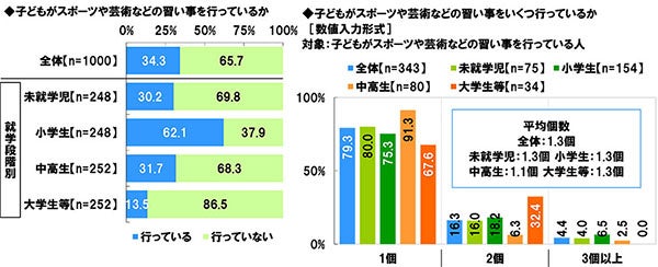 全回答者に、子どもがスポーツや芸術などの習い事(水泳やダンス教室、ピアノ教室、運動系部活、文化系部活など)を行っているか聞いたところ、「行っている」は34.3%、「行っていない」は65.7%となりました。