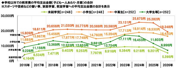 平均支出金額の合計を昨年の調査結果と比較すると、すべての就学段階において減少しました。特に中高生の親では、平均金額は例年同様最も高くなっているものの、2025年25,282円→2026年19,348円/月と、5,934円減少し、減少幅は最も大きくなりました。(図11)