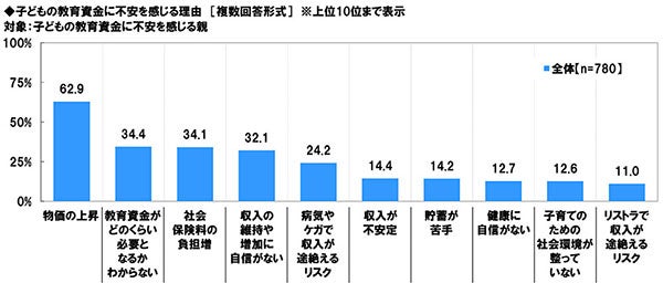 ・「子どもの教育資金に不安を感じる」親の8割弱、不安を感じる理由 「物価の上昇」が3年連続1位
