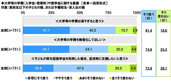 高校生以下の子どもの親、または予備校生・浪人生の親(751名)に、大学等の学費(入学金・授業料)や奨学金に関する意識について質問しました。