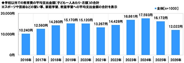 ◆学校外教育費の平均支出金額は12,022円/月、