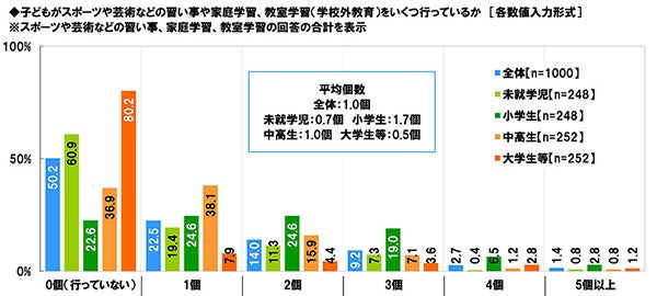 全回答者に、スポーツや芸術などの習い事、家庭学習、教室学習(学校外教育)をいくつ行っているか聞いたところ、「0個(行っていない)」(50.2%)に半数の回答が集まり、そのほか「1個」(22.5%)や「2個」(14.0%)などにも回答が集まり、平均個数は1.0個となりました。