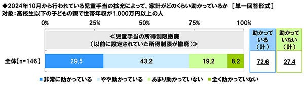 高校生以下の子どもの親で世帯年収が1,000万円以上の人(146名)に、2024年10月から行われている≪児童手当の所得制限撤廃(以前に設定されていた所得制限が撤廃)≫によって家計がどのくらい助かっているか聞いたところ、「非常に助かっている」が29.5%、「やや助かっている」が43.2%で、合計した「助かっている(計)」は72.6%となり、「全く助かっていない」が8.2%、「あまり助かっていない」が19.2%で、合計した「助かっていない(計)」は27.4%となりました。 (図25)