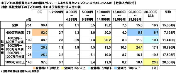 高校生以下の子どもの親、または予備校生・浪人生の親(751名)に、子どもの進学費用のための備えとして、一人あたり月々いくらくらい支出をしているか(※)聞いたところ、「0円」(36.4%)に最も多くの回答が集まったほか、「10,000円~14,999円」(15.2%)や「20,000円~29,999円」(15.6%)、「30,000円以上」(16.9%)にも回答が集まり、平均は15,684円/月でした。